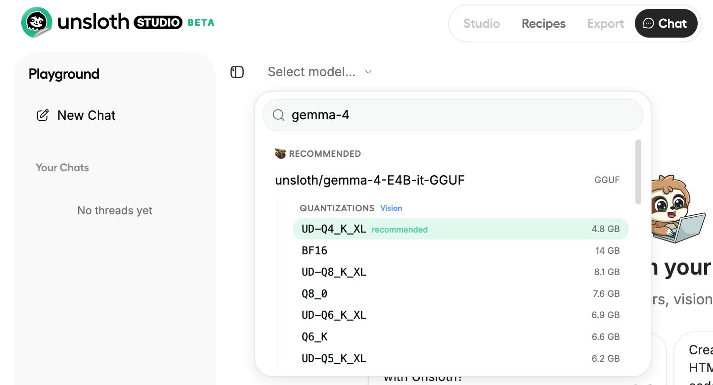 Go to the Studio Chat tab and search “Gemma 4.” Pick your variant and your quantization: use 8-bit for E2B/E4B and Dynamic 4-bit (UD-Q4_K_XL) for 26B-A4B and 31B. Hit download and wait.